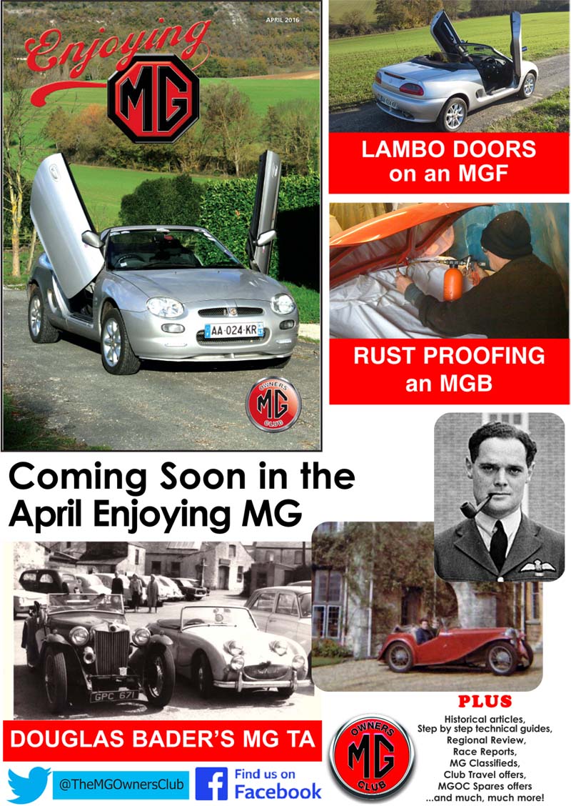 In this month's magazine we have a great feature on this superb MGF with Lambo doors, a tech tip on rust-proofing your MGB and an article on the famous WW2 pilot, Douglas Bader's wonderful MG TA.