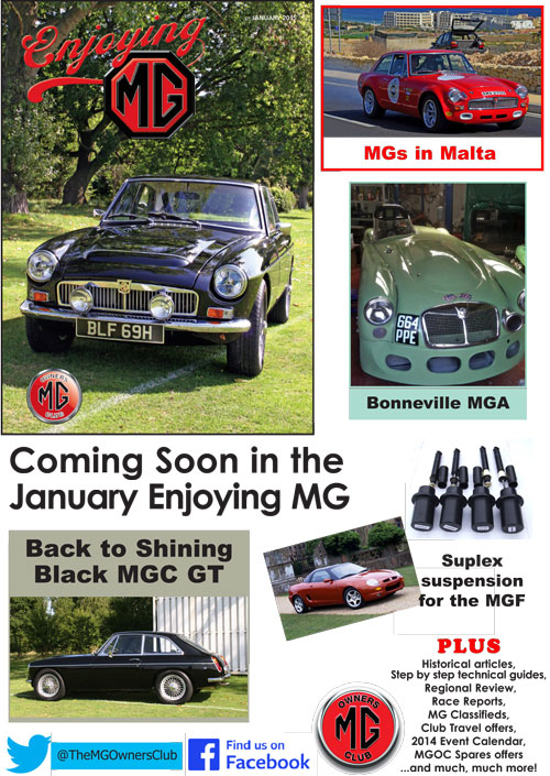 In this month's magazine we have features on a beautifully restored MGC GT, an interesting Bonneville MGA and suplex suspension for your MGF.