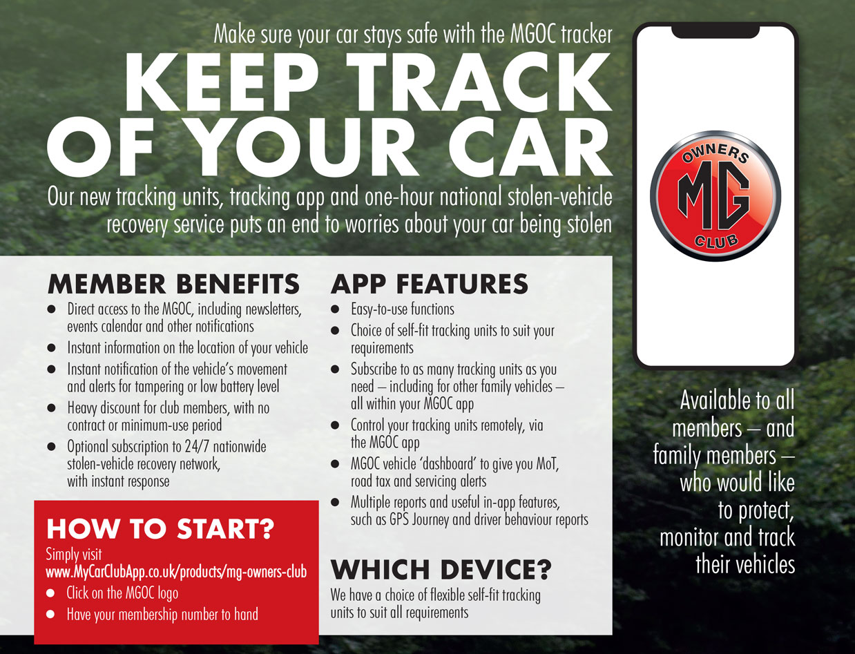 The MGOC has launched a smartphone tracking app linked to state-of-the-art tracking units. With real-time monitoring and tracking, your MG and other family vehicles can be protected, giving peace of mind when the car is left unattended or stored.